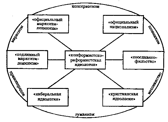 -наконец, наличие у общества идеальной цели – построения коммунизма, в осуществление которого, правда, никто не верит, но всё же ценит как красивую мечту, как суррогат религии.